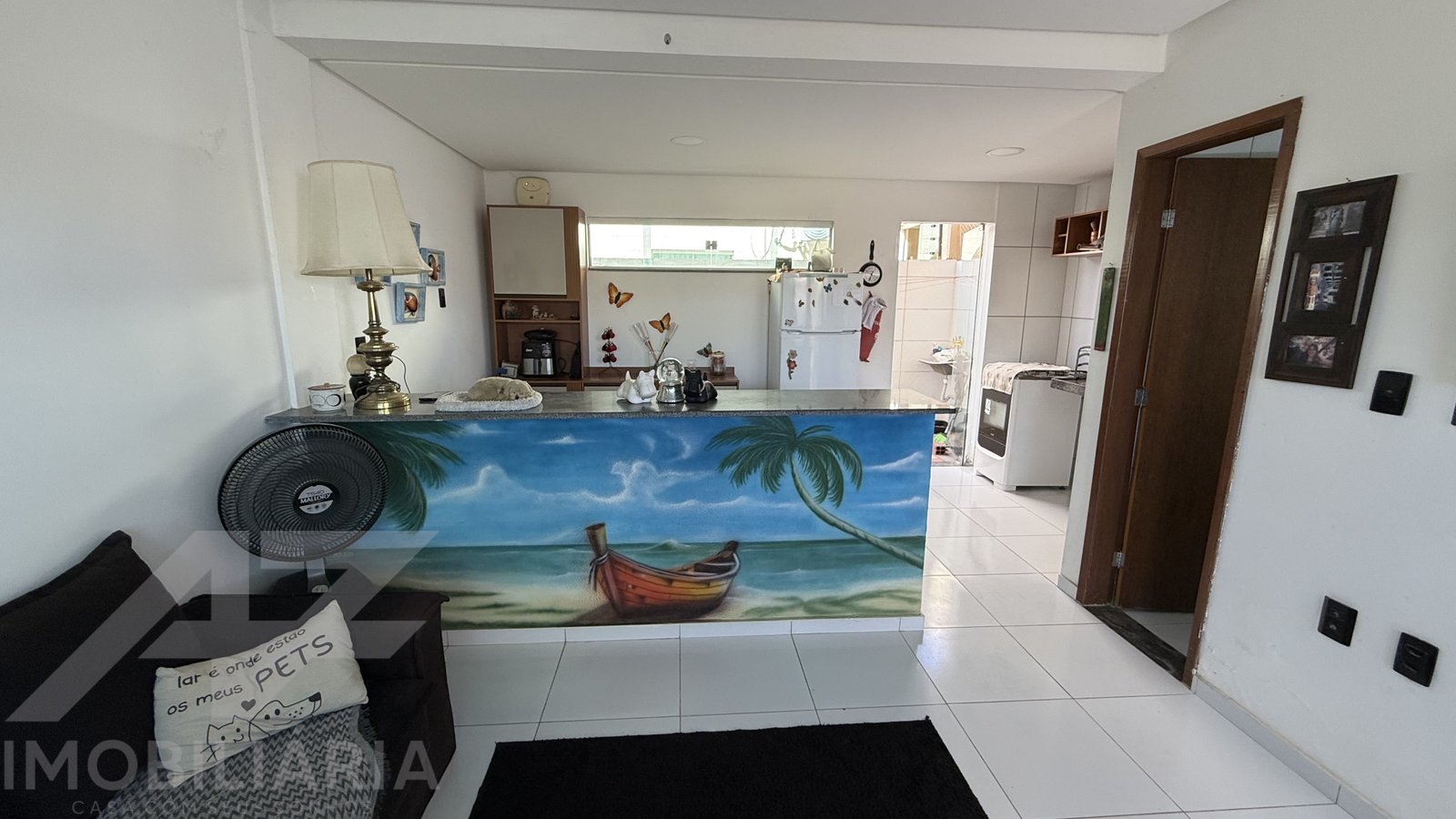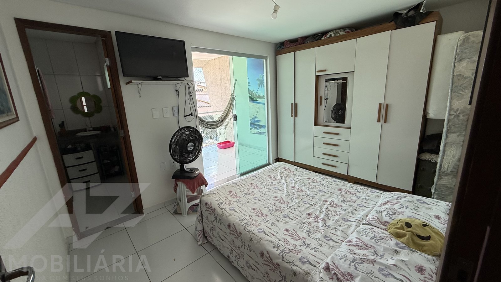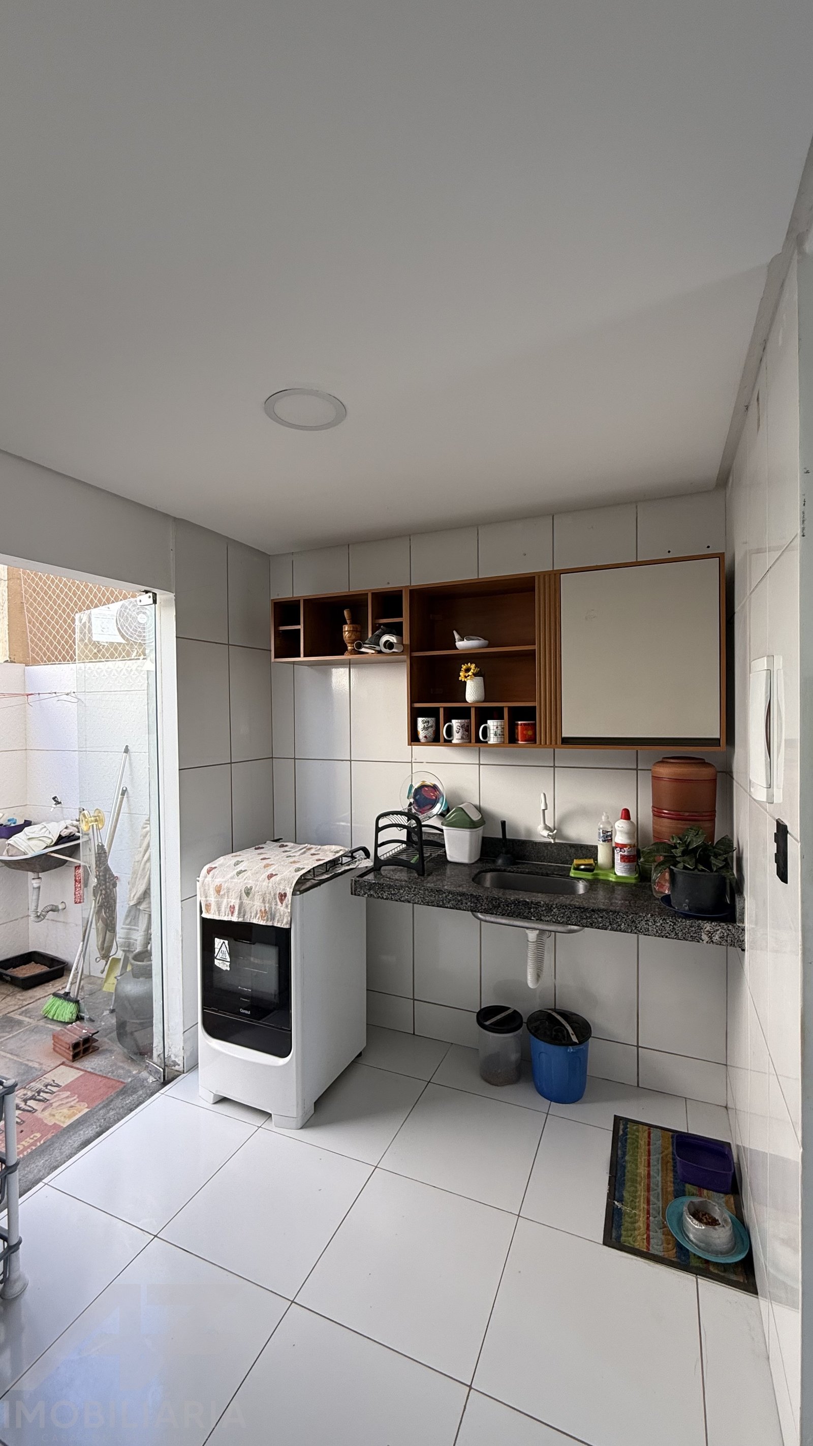 São duas suítes, sala, cozinha, banheiro social, garagem, quintal pequeno e varanda.